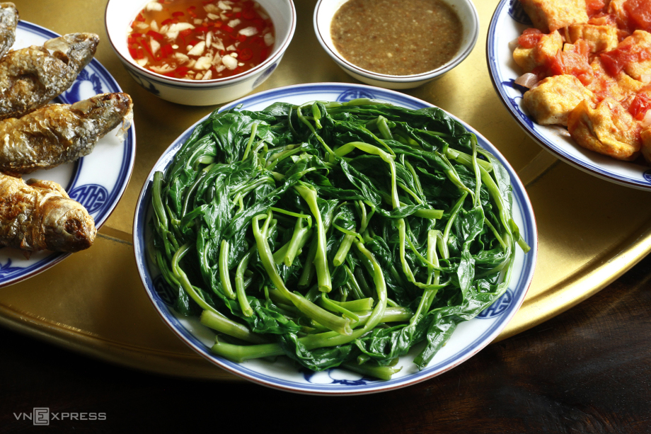 Bình dân, đơn giản nhất nhưng rau muống luộc lại là món ăn ”quốc dân” ngày nóng. Một đĩa rau xanh mềm cuộn nhỏ chấm với nước mắm tỏi ớt hoặc tương bần, mắm ngâm sấu giúp kích thích vị giác.